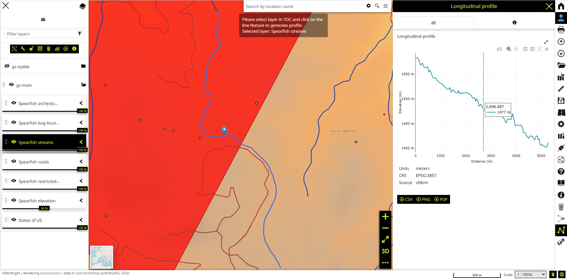 Given a DEM or bathymetric layer as a source and a path provided over it, this new tool allows the longitudinal profile to be calculated and displayed within an interactive chart. The tool runs on an equally new WPS process on the GeoServer side created for the purpose.